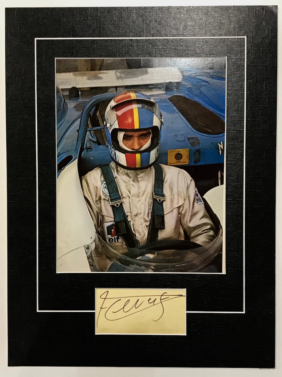 Beautiful original 8x 10 photo card of Francois Cevert sitting in his Matra MS650 at the 1970 Daytona 24 Hours. Included in this lot is a rare Cevert signature is mounted below the photo.