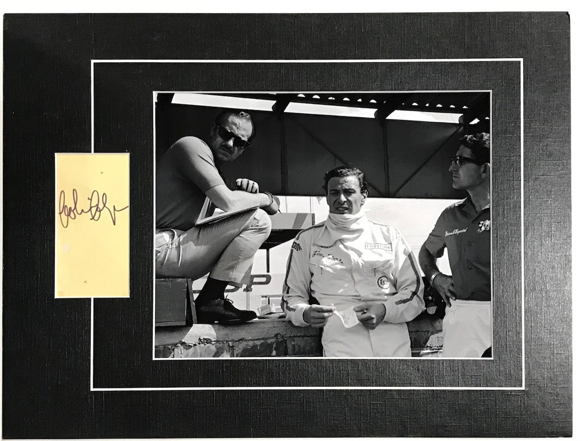 The bonus of this item is on the back side of the Cevert autograph card Colin Chapman signed it. This is paired with a photo 8x10 photo of Chapman and Jim Clark.Both signatures and photos are mounted on black matting ready to frame.