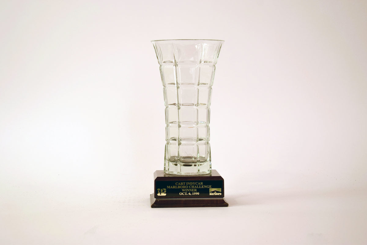 The trophy's metal plaque is inscribed as follows: CART INDYCAR MARLBORO CHALLENGE WINNER, OCT. 6, 1990.