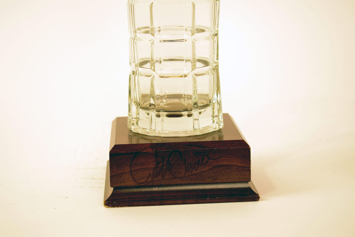 This beautiful crystal glass trophy sits 12 inches high and is mounted on a mahogany wood base with original metal plaque.