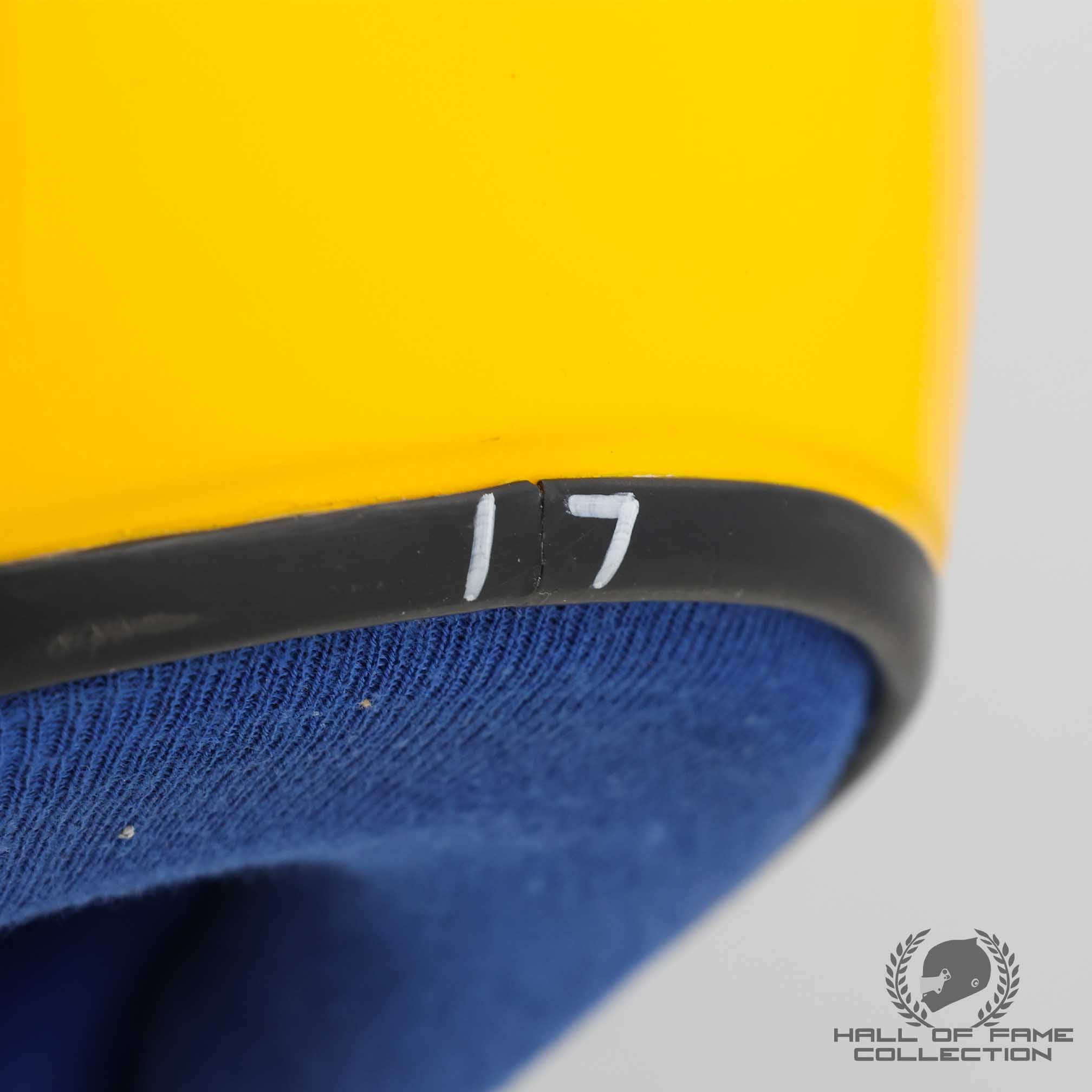 According to Mosca, the blue and green stripes symbolized movement and aggression, while the yellow represented youth. The color scheme also reflected the Brazilian flag. From then on, the helmet design remained largely unchanged, except for minor tweaks, such as Senna occasionally swapping the blue stripe for black. The shade of yellow also varied throughout the years, often a rich sunburst yellow, but in 1985 and 1986, Senna used a fluorescent neon yellow. In 1994, he opted for a lighter, paler yellow to match the blue and white of the Williams car.