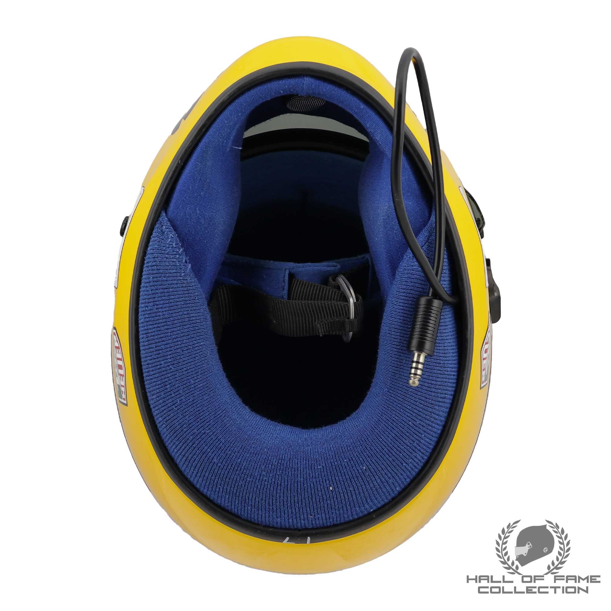 During his karting days, Senna’s helmet was simple, featuring a plain white design with no notable features. Over time, he experimented with various styles, such as a white, yellow, and green helmet, before adopting a design created by Sid Mosca. This iconic look, first seen in 1979, featured a yellow background with a green stripe around the upper visor and a light metallic blue stripe around the lower visor, with the colors contrasting each other.