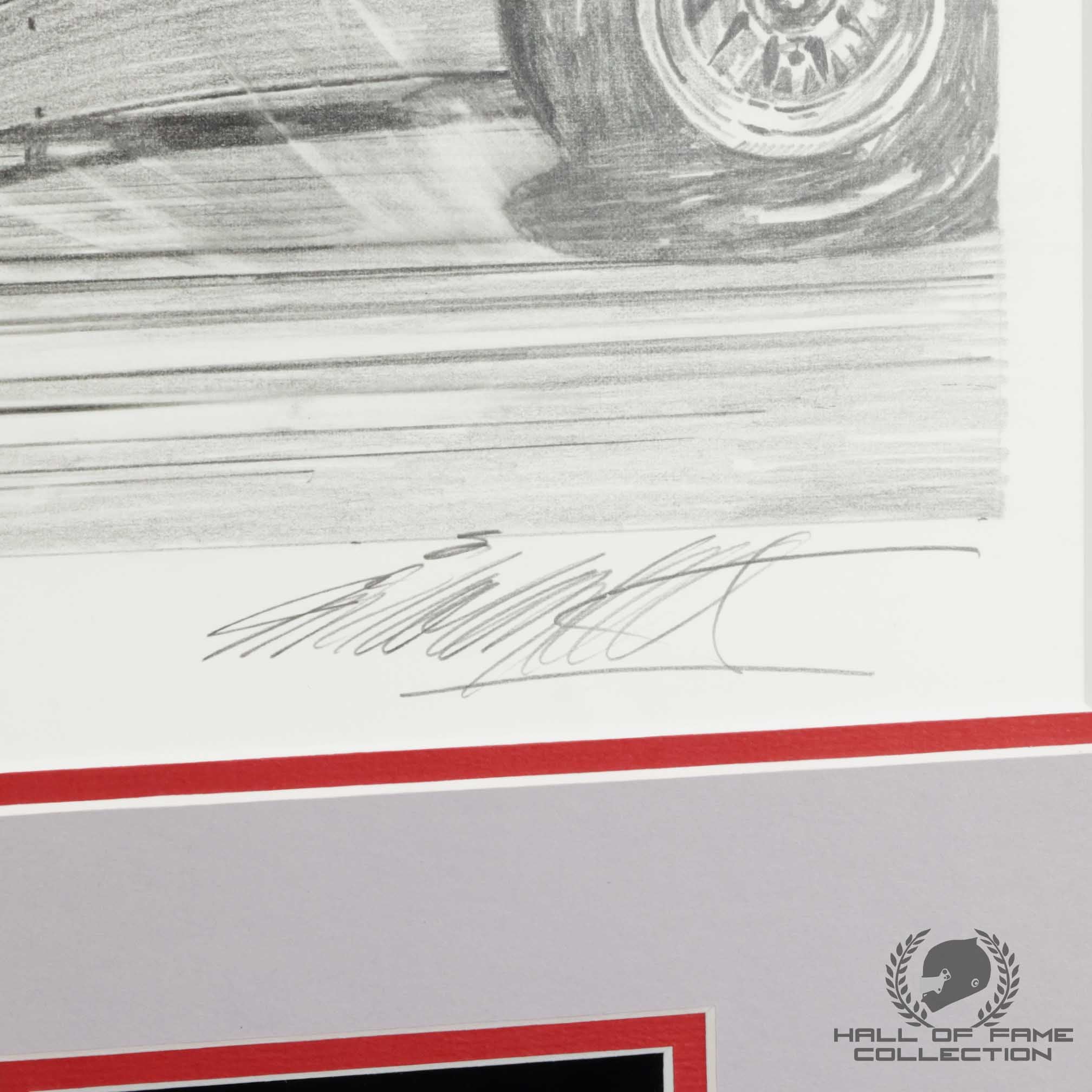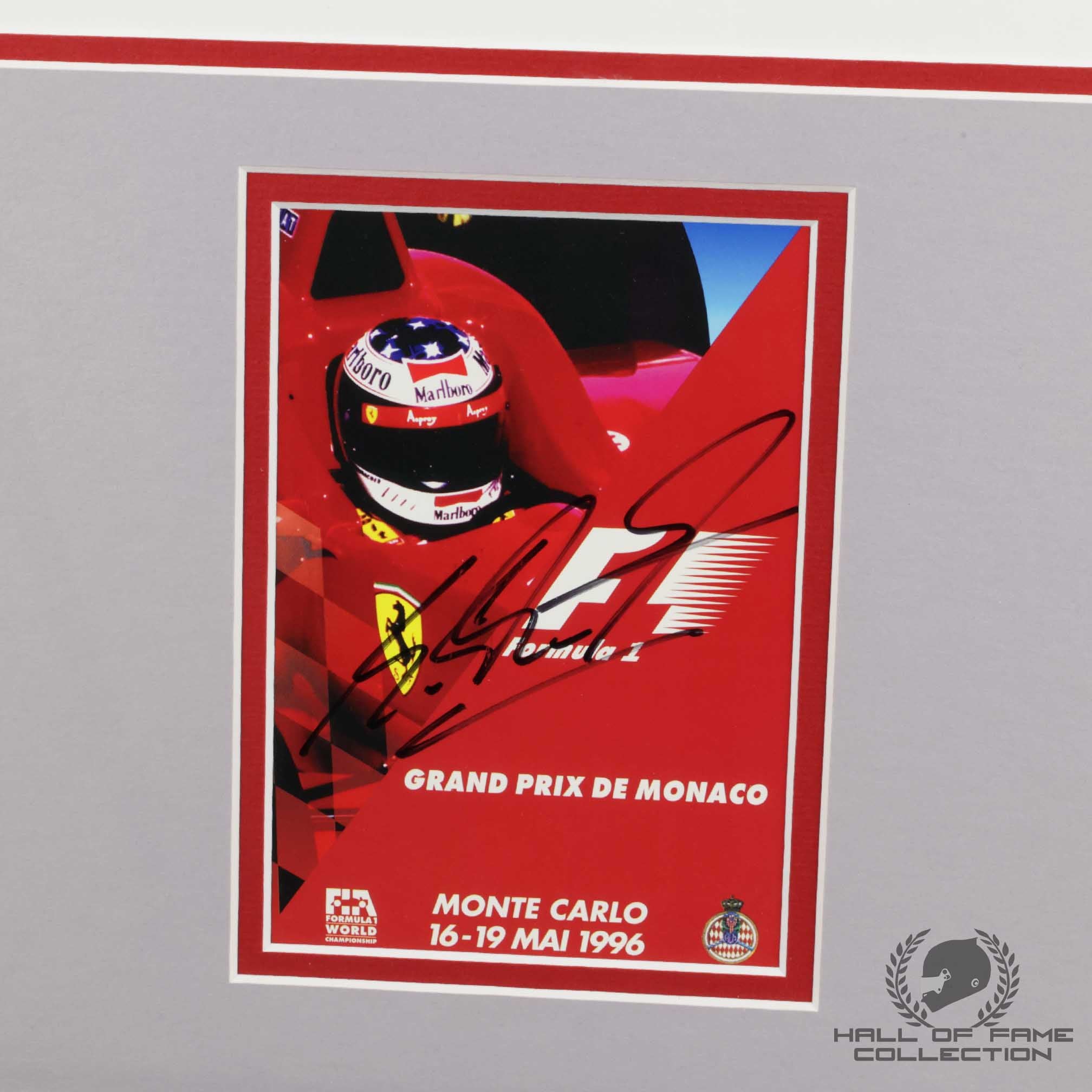 Nicholas Watts original pencil drawing is framed with Schumacher signed Monaco GP card and a Ferrari shield detail.