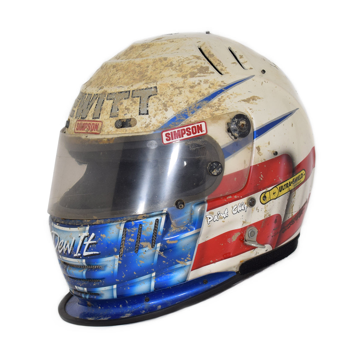 This Simpson helmet was worn during that historic 1998 season. The white helmet has Paint Chip Designs, airbrushed blue chin and cheeks that contains a square graphic design which has the words ‘Dew it’ to the front. There are four blue flashes (two either side) that come off the eyeport opening that go over the sides. Two red bands run around the bottom and middle. Hewitt’s surname is to the front top in silver and black. The helmet has an added chin spoiler and still retains race dirt is USAC tech sticker and comes as last worn.