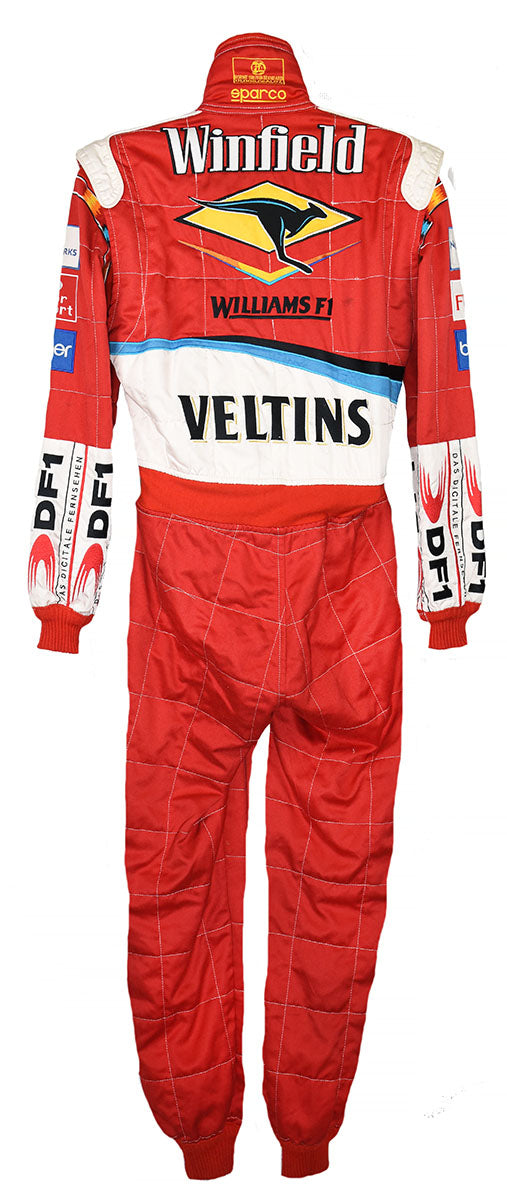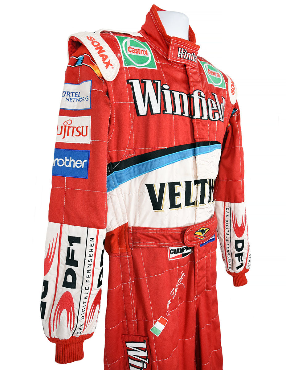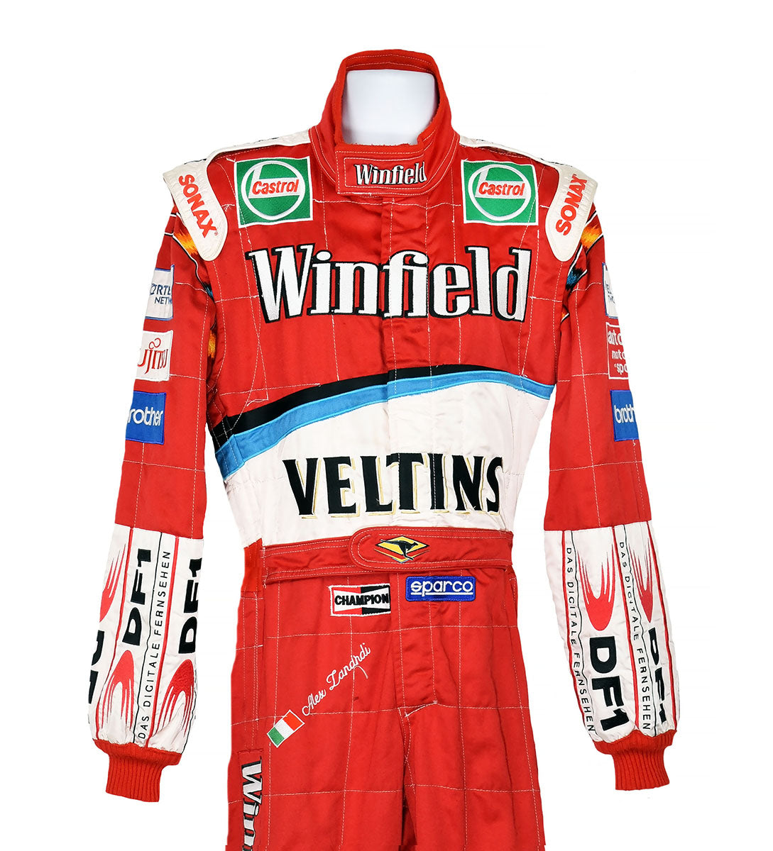 A Winfield Williams race-used suit worn by the popular Italian driver Alex Zanardi in his one and only season driving for the Williams team in 1999. After four years in F1 in the early 90s, Zanardi headed to the USA to compete in the CART IndyCar Championship, winning two championships in 1997/98. This success caught the eye of Sir Frank Williams and Zanardi was offered the drive in the Williams team’s FW21 machine. Zanardi struggled all season with reliability issues and handling characteristics of the grooved-tire F1 car and failed to score a point. This saw Zanardi and Williams parting company and the end of the season.