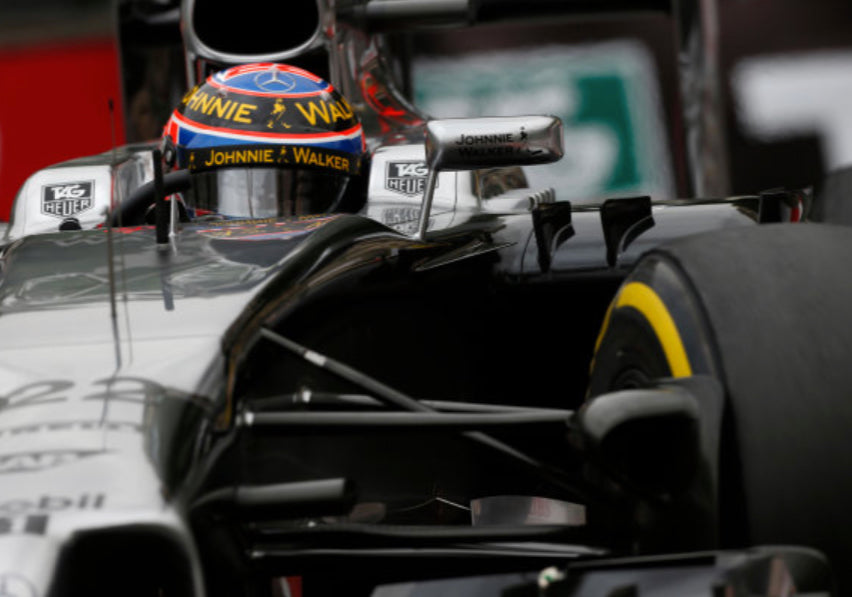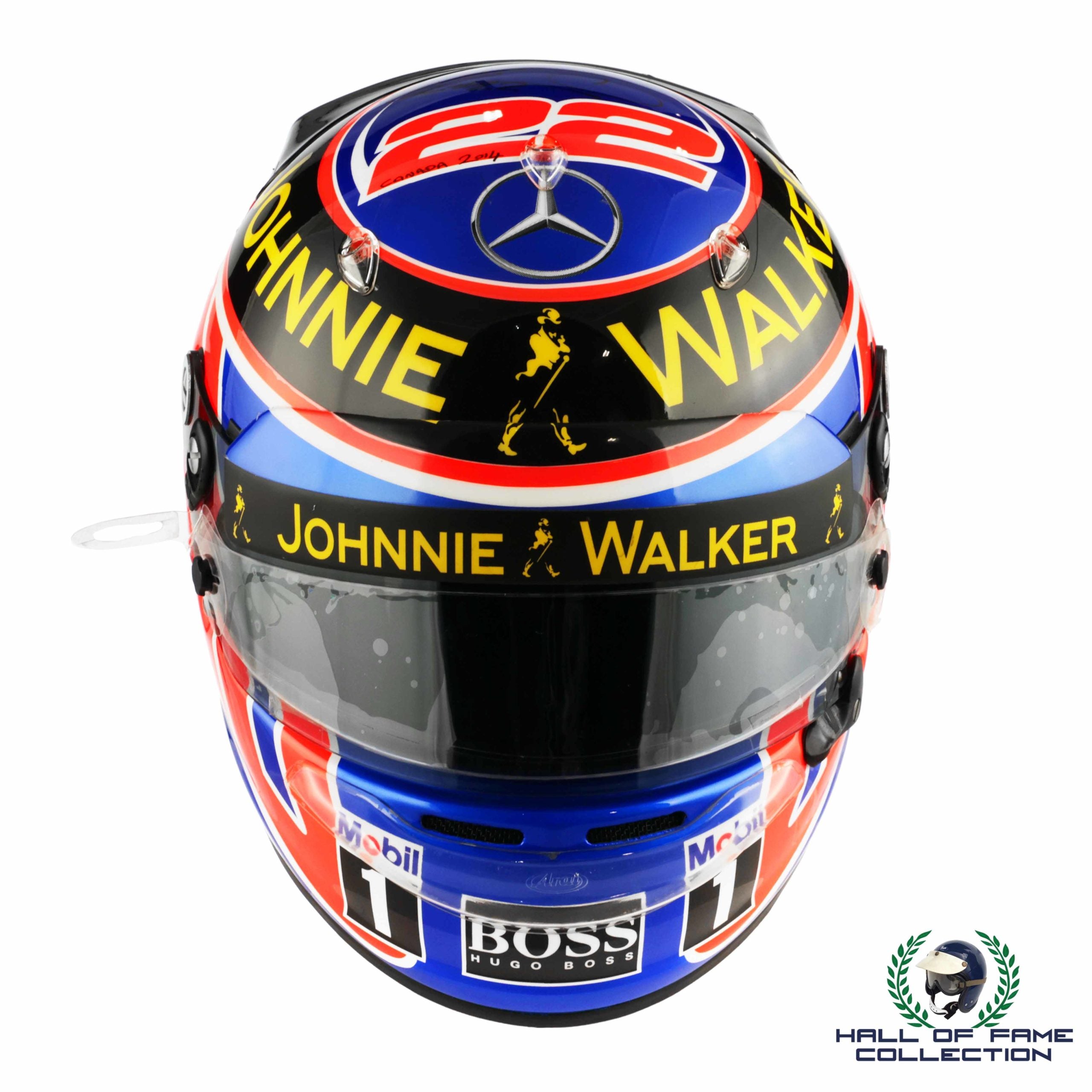 This fantastic looking helmet was hand painted by UFE Designs for Button. The British F1 World Champion was in his 5th season with McLaren in 2014 and finished in the points in 13 out of the 19 races that season. The helmet was the 4th one painted for Button and documented at the time with the following history: China Qualifying, Monaco FP1, Canada FP1 & Race, Austria FP1, Goodwood demo and Germany FP1. The helmet can be seen in many photographs including ones of his 4th place finish at the Circuit Gilles Villeneuve in Montreal, Canada.