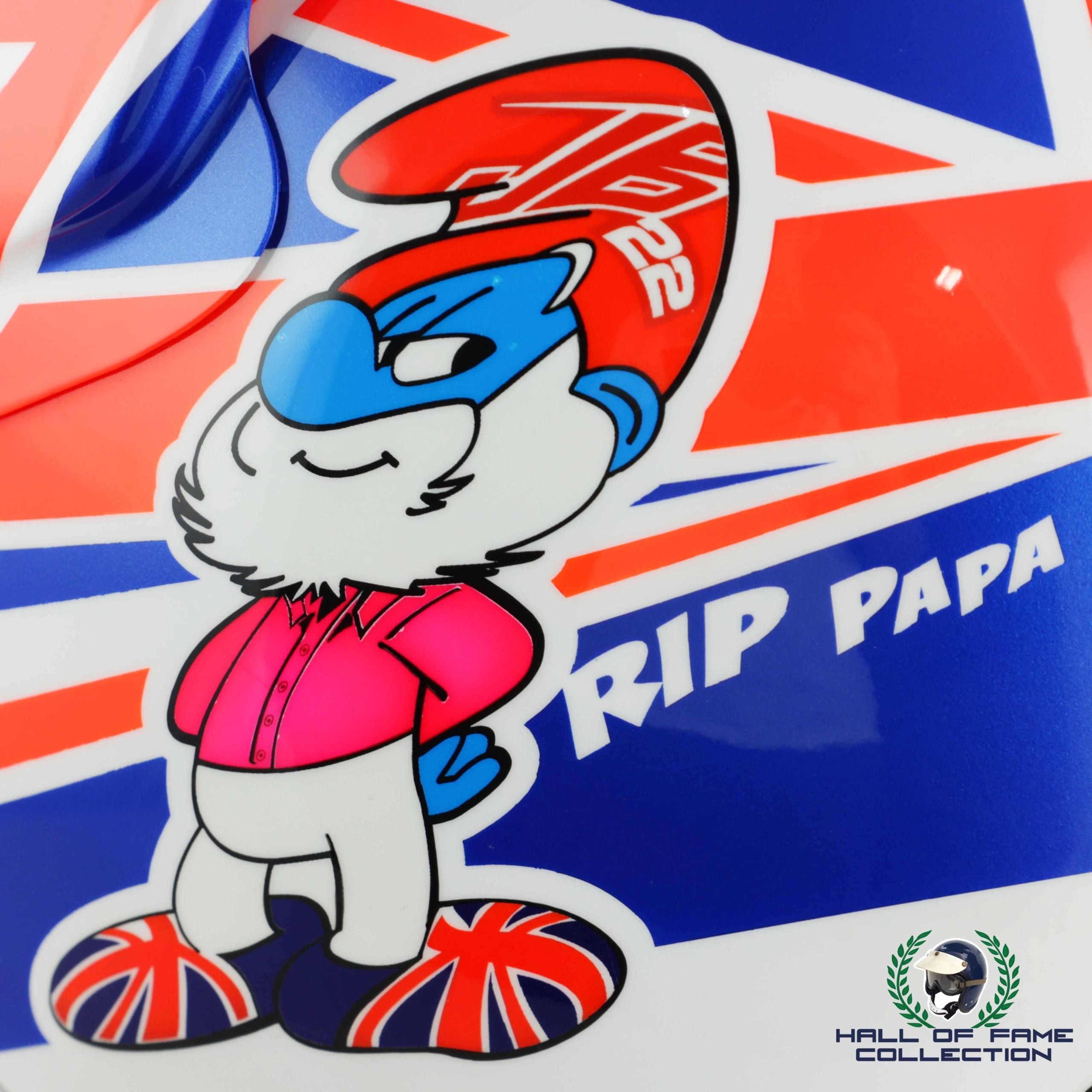 This Arai GP-6RC (racing carbon) was a state-of-the-art helmet at the time and comes with its original visor, tear-offs and zylon panel still attached. All the Arai added aero parts, spoiler and HANS clips are still attached to the helmet, just like they were when it was last used by the British driver. The helmet paint includes Button's number 22, the JB on each side done in his famous Union Jack style and Papa Smurf on the back as a tribute to John Button, Jenson's Dad, who had passed away in January of 2014.