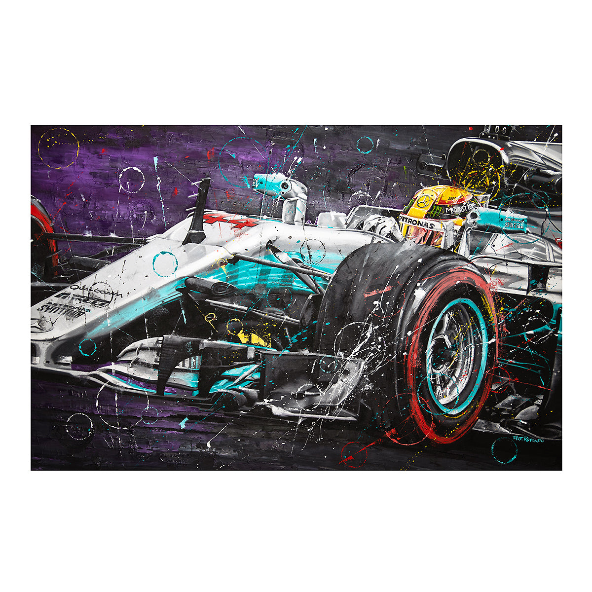 We are proud to offer this unique original oil-on-canvas painting entitled “Sensational” by Canadian motorsport artist Arturo ‘Art’ Rotondo. The work depicts Lewis Hamilton driving his 2017 Mercedes W08 on his way to record a fourth F1 World Championship crown, in a season that truly cemented Hamilton in history as one of Formula 1’s greatest drivers. The size of the work is 24×36″ (canvas size) and is on stretched canvas over a wood base structure. It is hand signed on the back by Arturo. It is also accompanied by a Letter of Authenticity from Arturo and is protected in an exclusive Art Rotondo carrying bag.