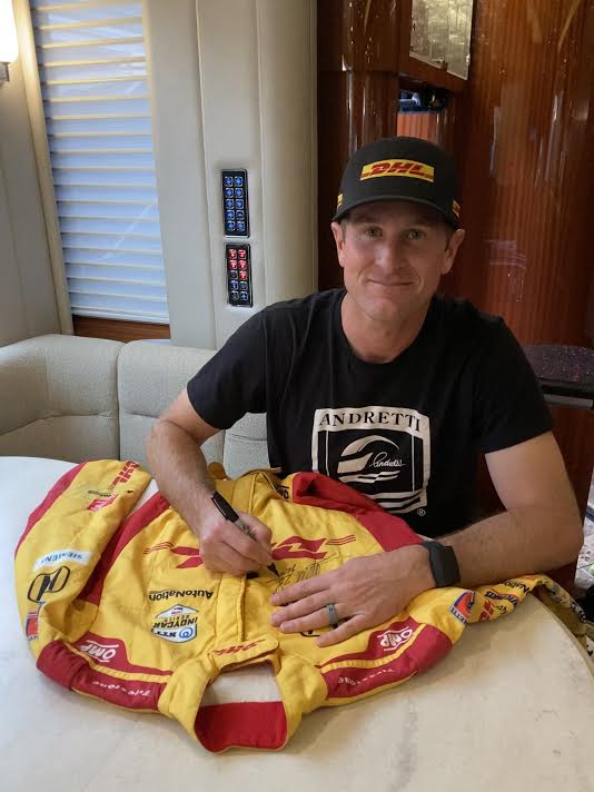 The suit comes from Hunter-Reay's personal collection and has been signed by him on the chest in black marker pen.