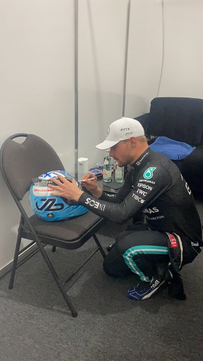 Stilo helmet worn by Valtteri Bottas during the 2021 Mexican GP race where put his Mercedes W12 on pole as well as setting a new track record race lap. This particular model, a ST5-VB, was built to his specific specs and the graphics were designed by his girlfriend, Tiffany Cromwell. The design incorporates a winter theme with snow flakes on the crown, finished with a ribbon of the Finnish flag and #77. The rest of the helmet has a snow squall effect with his VB logo integrated into it and with his #77 featuring on the sides with a howling wolf head on the back. The helmet is finished off with a dark blue lining inside with Finnish flags on either side of the eye port foam. It still has the drink tube and visors tear-offs attached, just as it was when last used in the race at Mexico. The helmet shows great race wear with stone chips and bits of rubber/debris splattered across it. It comes directly from Bottas, right after the Mexico race, and is signed by him in black marker pen.