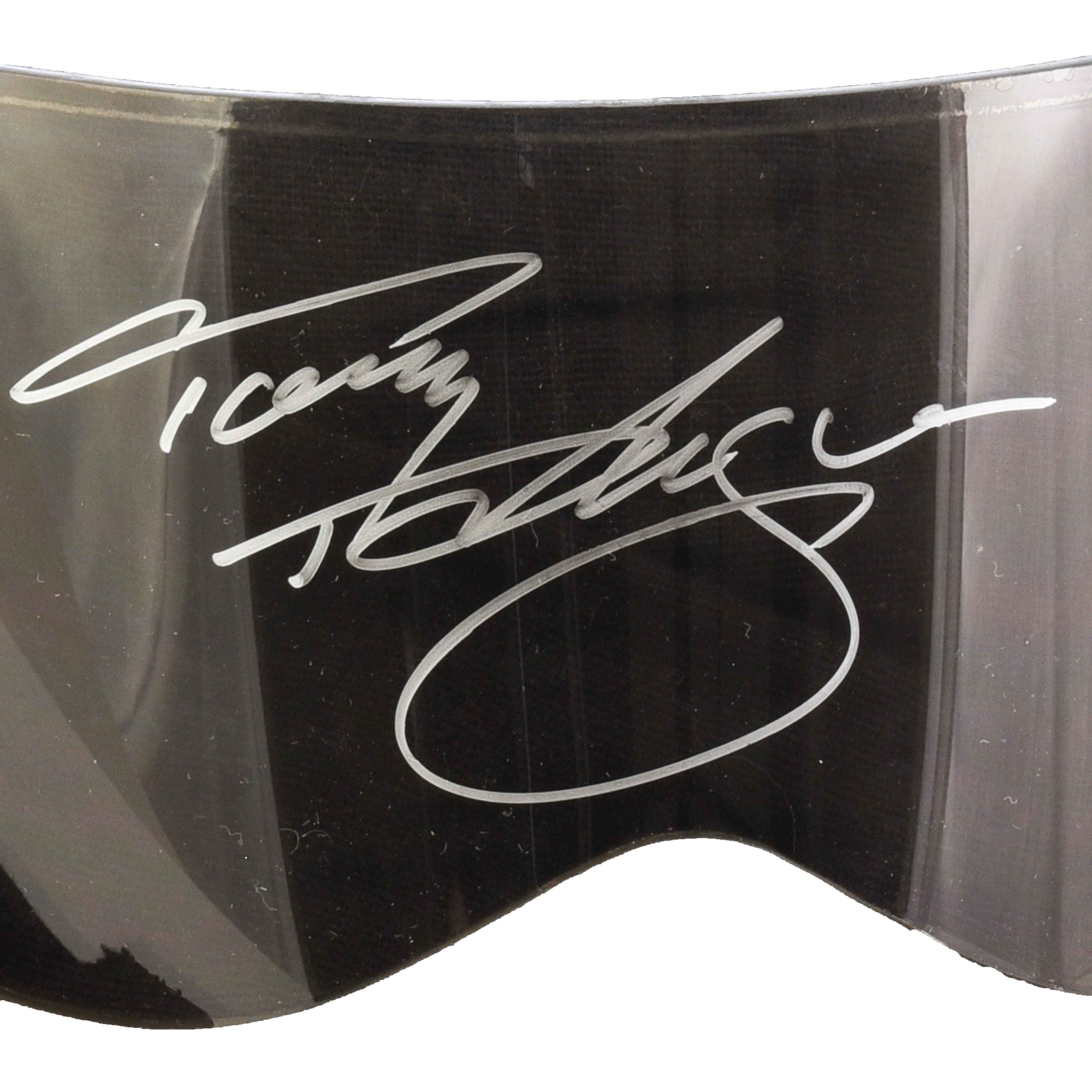 The clear, tinted visor has Simpson branding logos on the sides and is signed by Tony in silver marker pen.